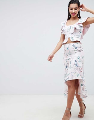 Forever New u2013 Blommig kort topp och kjol med volang u2013 Del av set